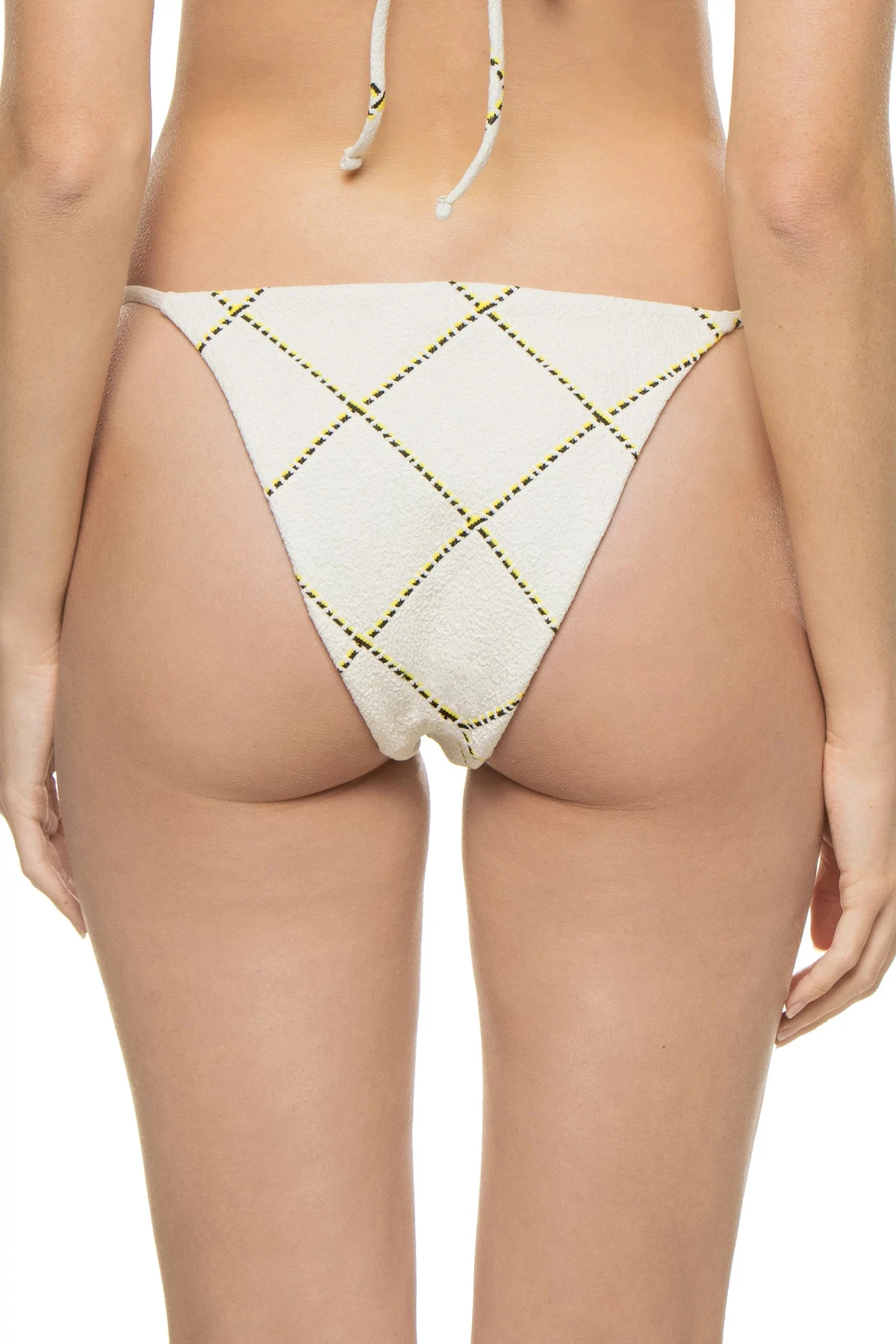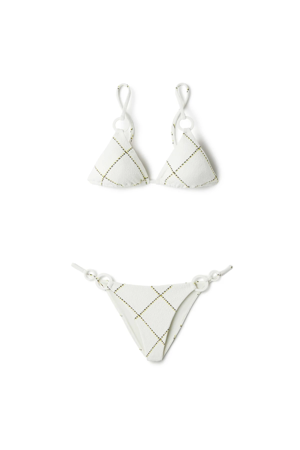 Alaya brazilian bikini bottom features a puckered texture with ring accents at hips and offers minimal coverage.