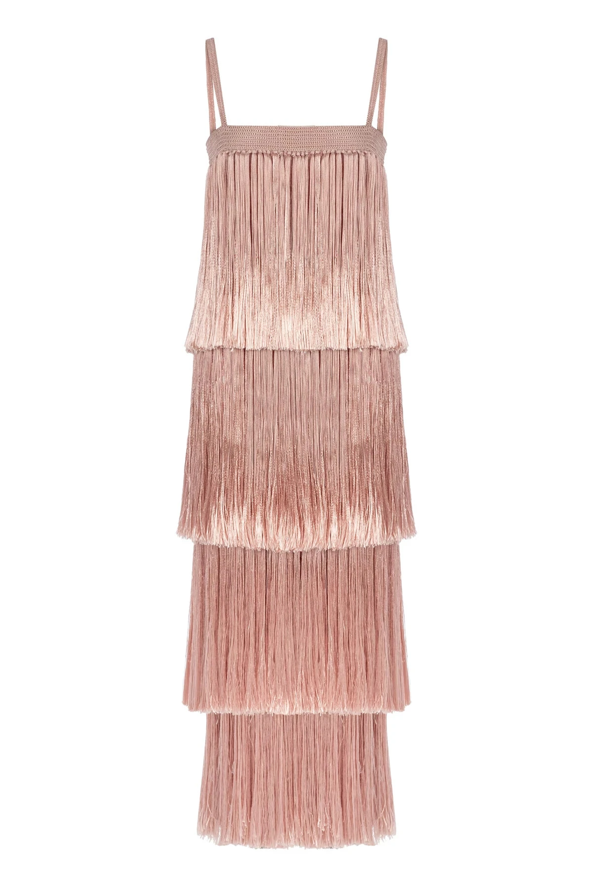 Angelica Fringed Maxi Dress is hand crocheted with tiers of silky fringe, an elastic band at the top and spaghetti straps that can be worn in or out. The perfect blend of beachy boho chic with effortless, stand out glam.