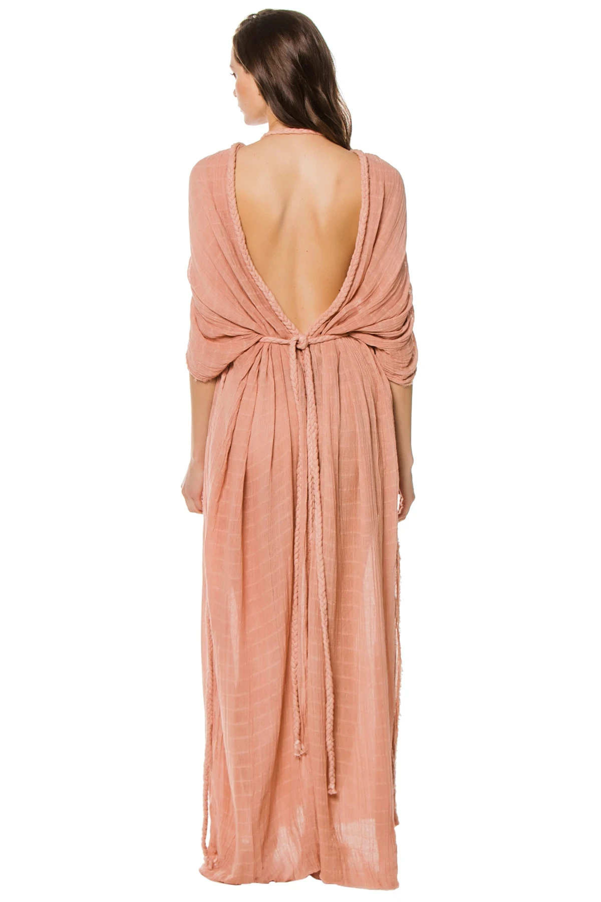 Athena goddess gown is a full length free-flowing silhouette individually handcrafted and draped in a Grecian technique. This elegant gown features handmade braids that can be belted around the hips or waist to create a form-fitting dress. One size fits most. Every dress is handmade in soft cotton gauze fabric then dyed individually by hand in non toxic dyes. Inspired by nature and historic ancient walls in the Yucatan.