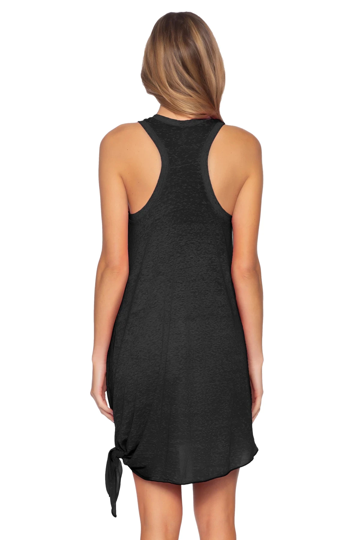 Mini dress features a high neckline with an adjustable knot side tie, slub burn out knit fabric and pockets.