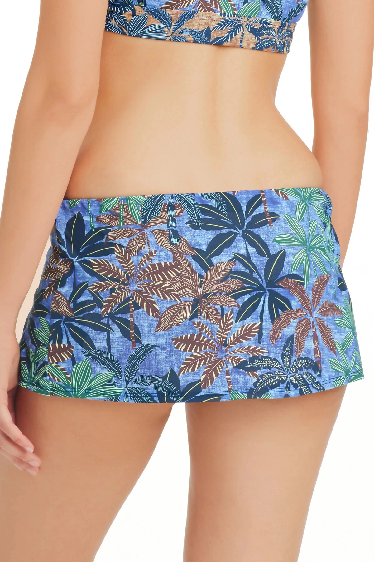 Swim skirt features a cool toned tropical print with a side slit. Offers full coverage.