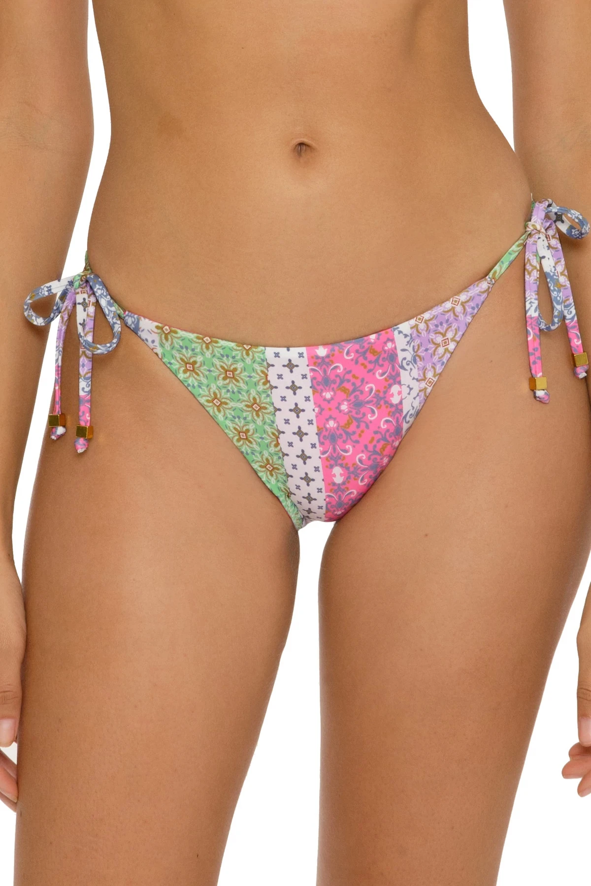 Demi reversible hipster bikini bottom features adjustable ties at hips with gold beads and moderate coverage.