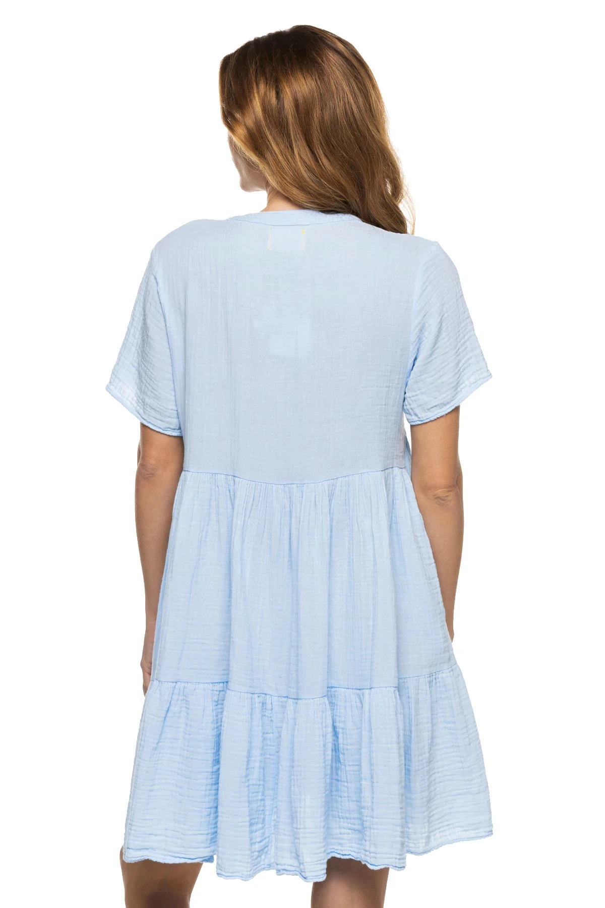 El Matador dress features a flattering v-neckline with short loose sleeves and a lightly ruffled and tiered short skirt.