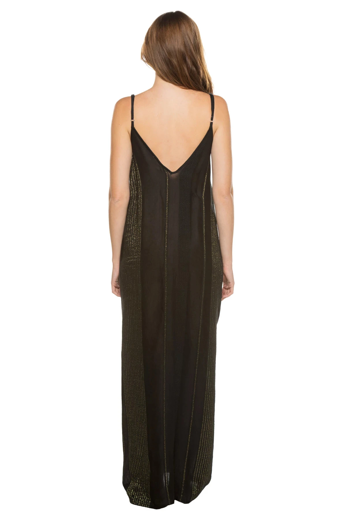 Maxi dress features a flattering deep v-neckline with metallic design. Offers thin adjustable over the shoulder straps with a v-cut back and pockets.