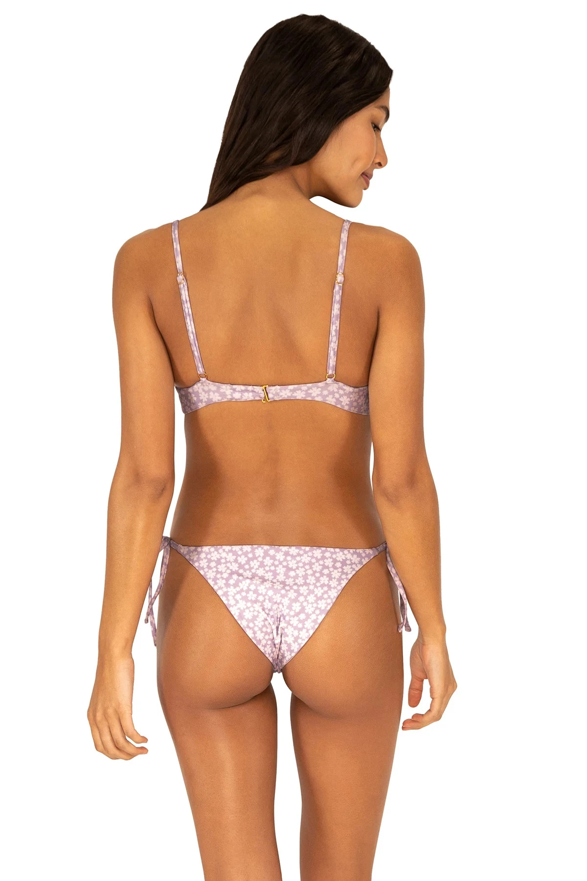 Elizabeth bikini top features a floral print with ruffle trimming and a supportive under bust band. Offers underwire and adjustable shoulder straps with a hook back closure.