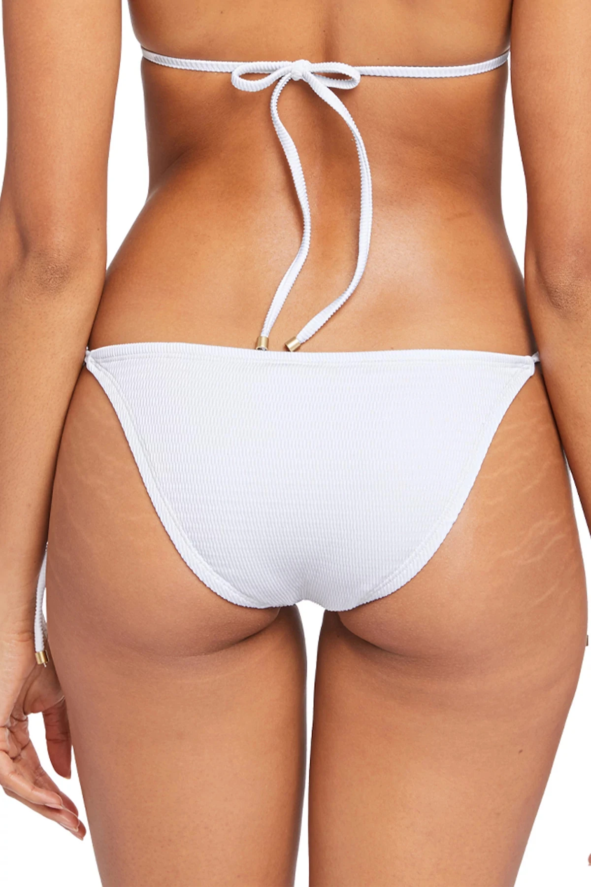 Elle brazilian bikini bottom features textured fabric and adjustable ties at hips with gold tipped ends. Offers minimal coverage.