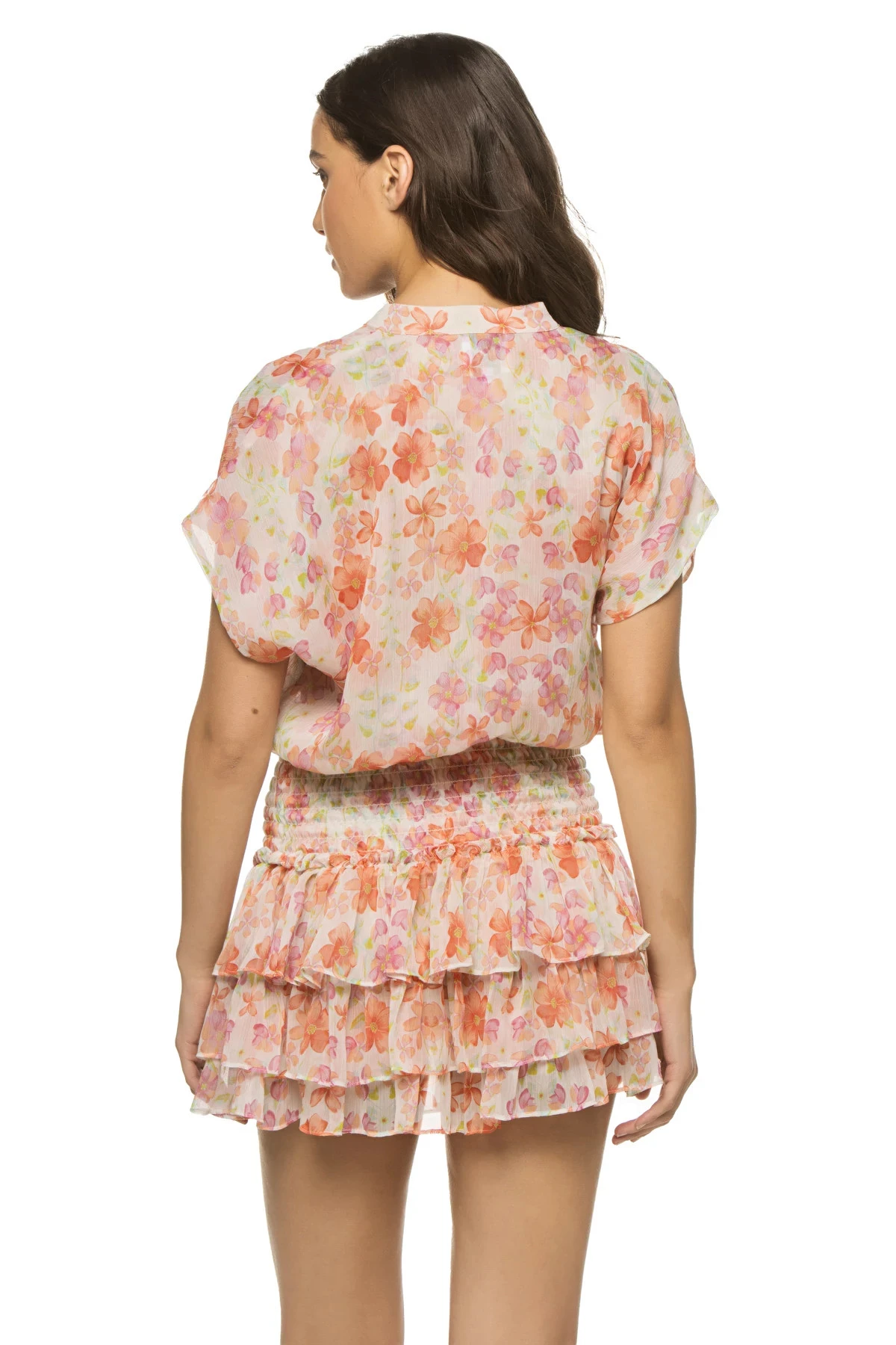 Eloisa mini dress features a floral print with short sleeves, smocked waistband, and tiered skirt. Offers a button up closure.