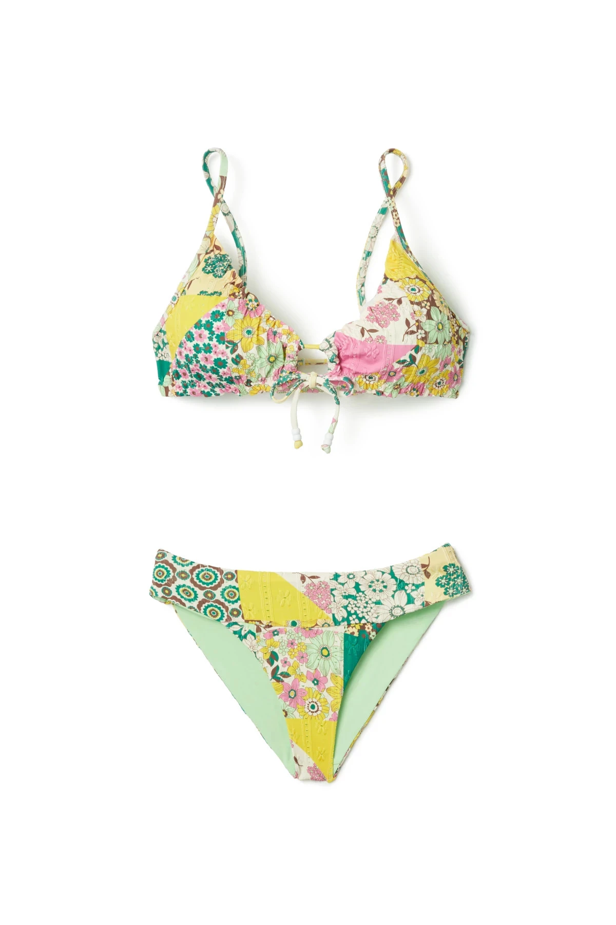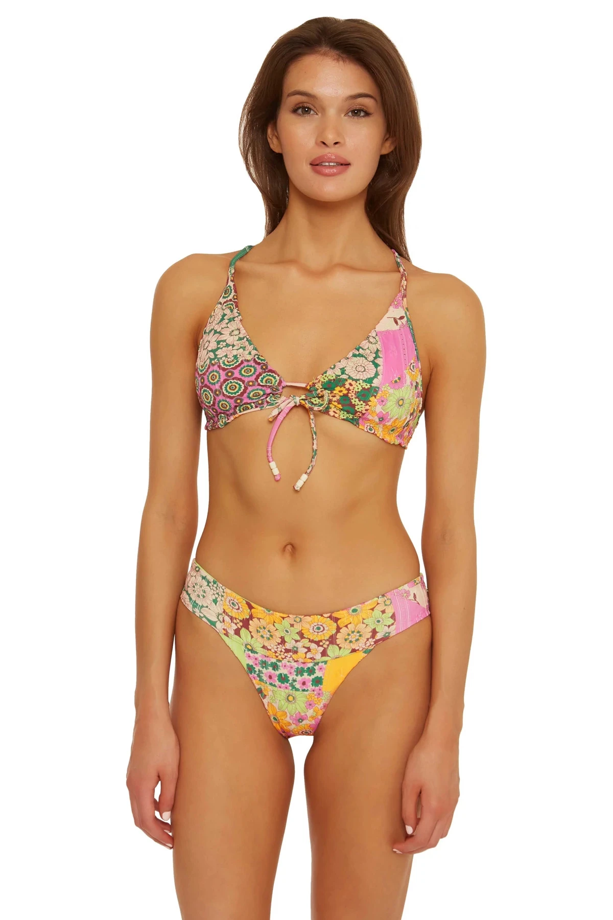 Embrace triangle bikini top features a ditsy floral print with a tie front and bead details. Offers removable soft cups and adjustable straps.