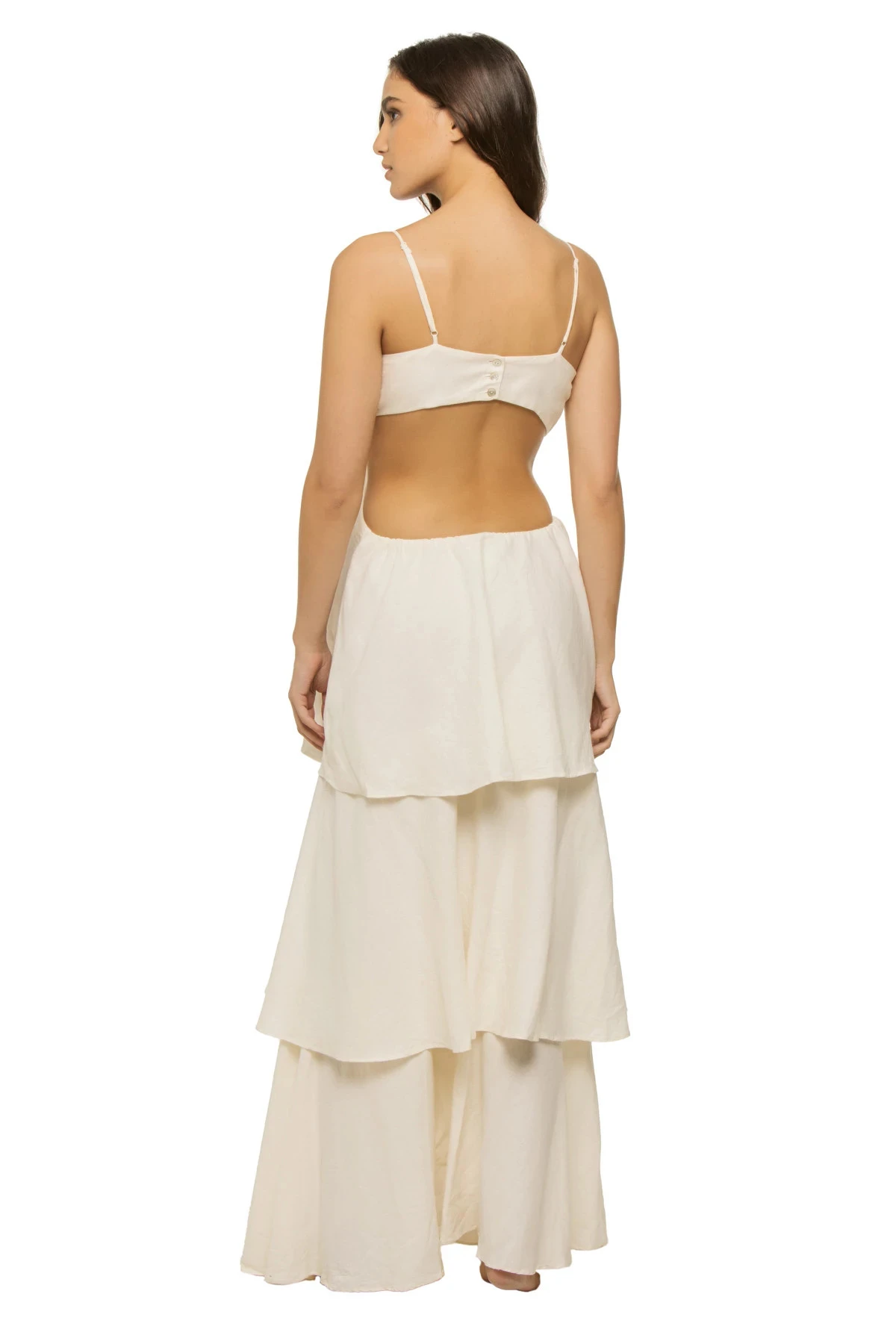 Off-white maxi dress features a flower detailed top with side cutouts and a tiered skirt. Offers adjustable shoulder straps.