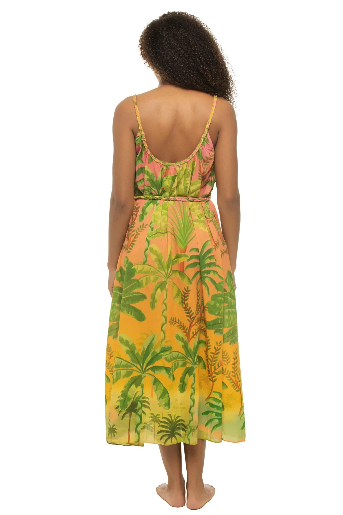 Sunrise scenario midi dress features a double scoop braided neckline and offers a relaxed fit with a braided tassel belt.