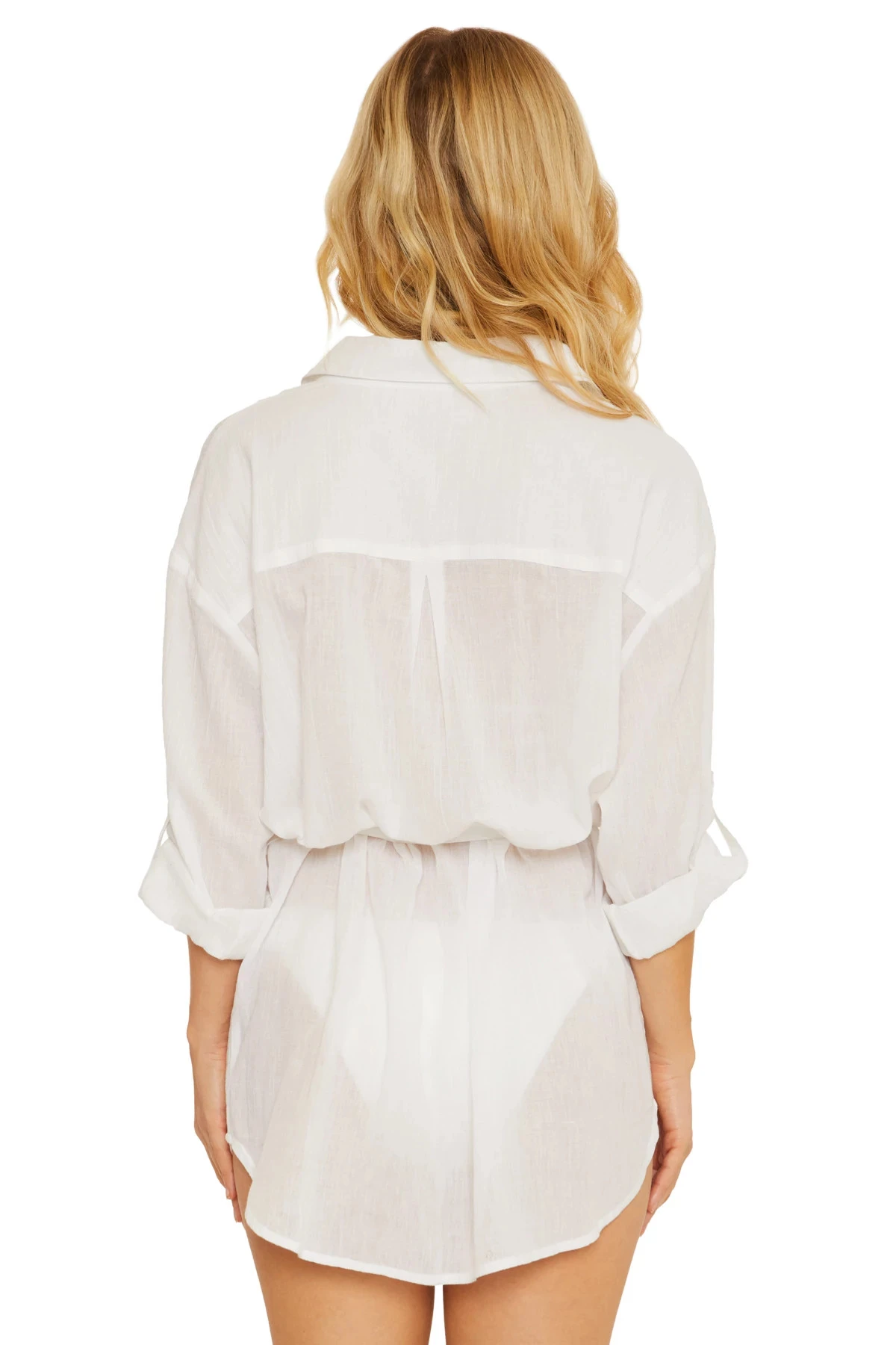 Gauzy shirt dress features a collared neck with front shell buttons and long sleeves that can be cuffed at three quarter length and offers a removable sash belt.