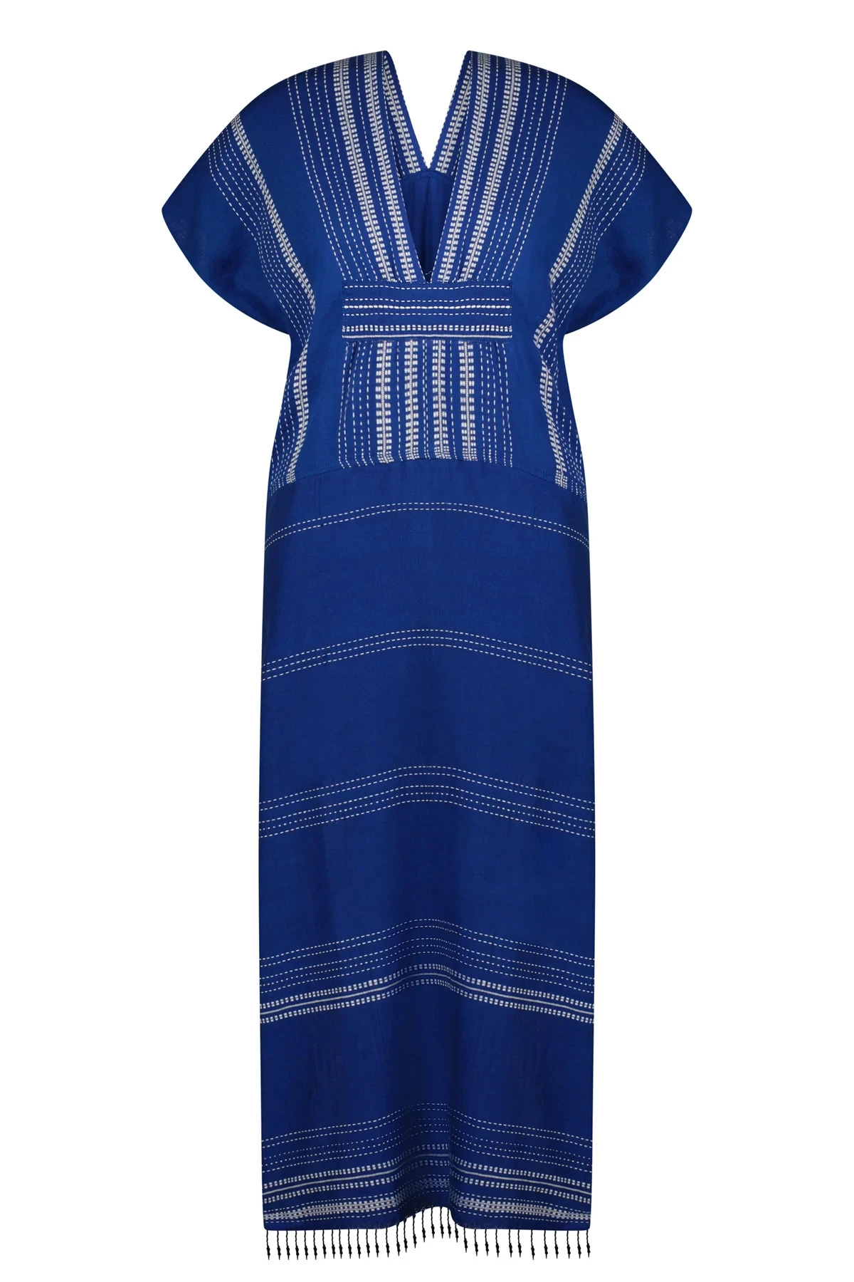 Inku midi dress features textured white dots playfully placed to fade-in and fade-out on the deep ocean blue silhouette made by the most skilled artisans. Offers a v-neckline, kimono cap sleeves, and a gathered empire waist.