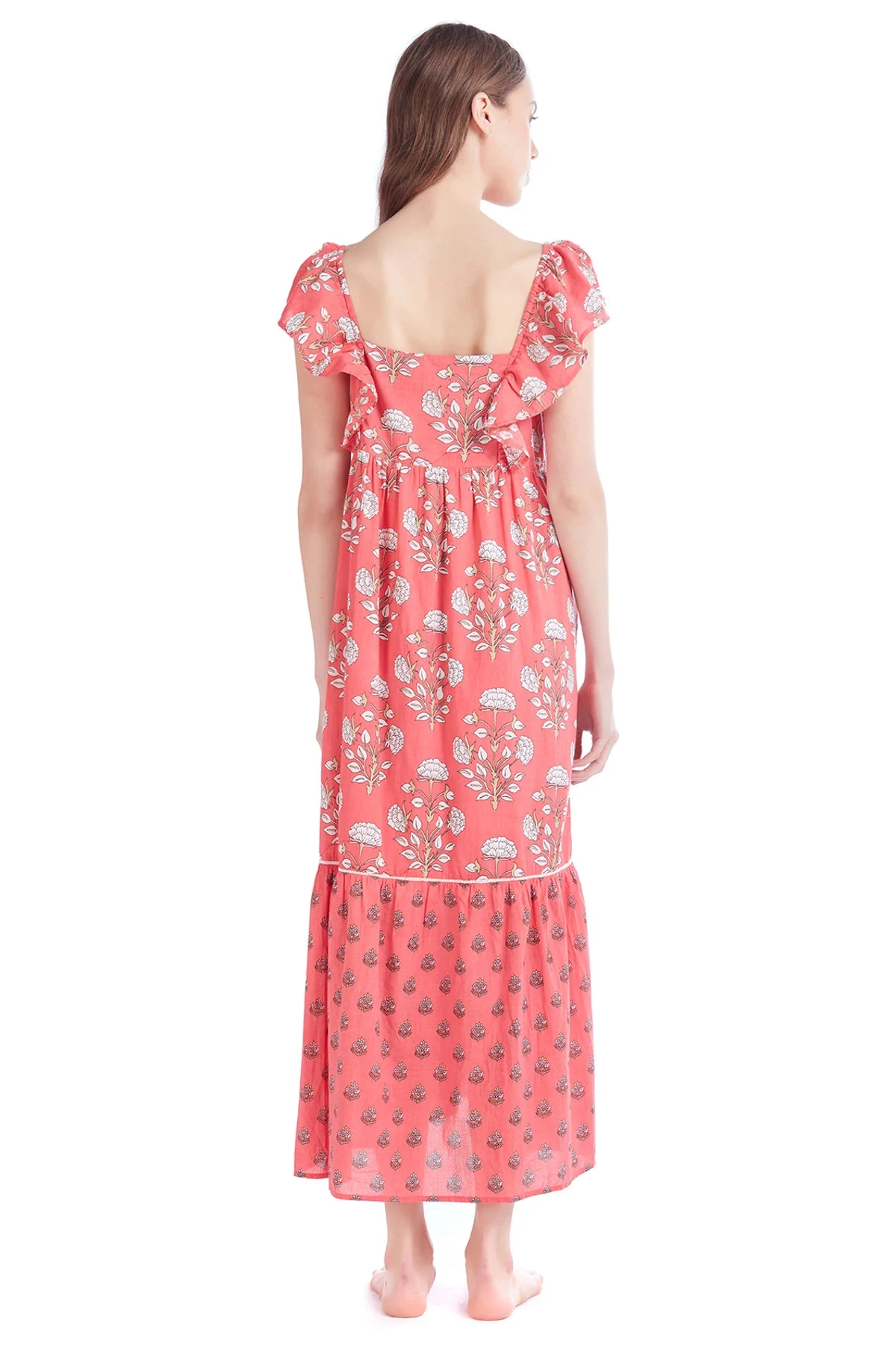 Jimmy midi dress features a straight neckline with elastic flutter sleeves, an empire waist and a tiered skirt.