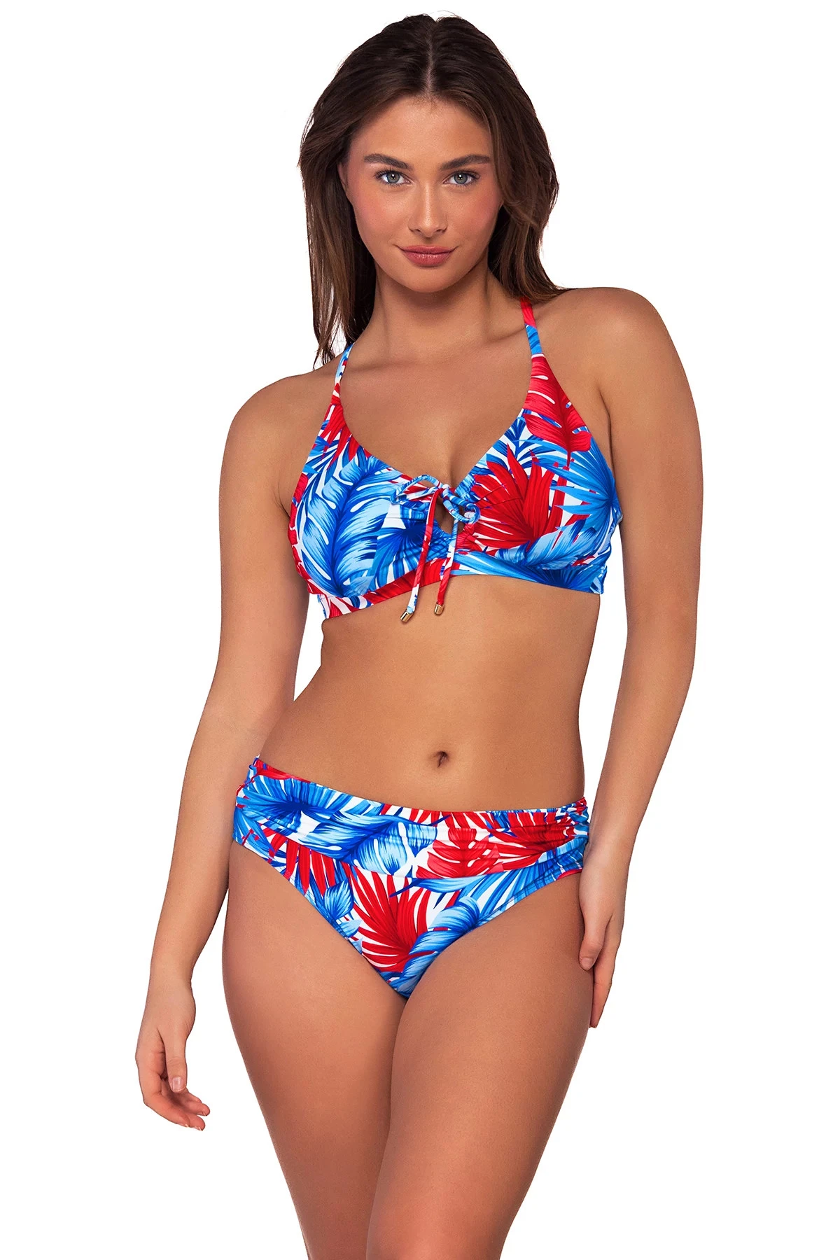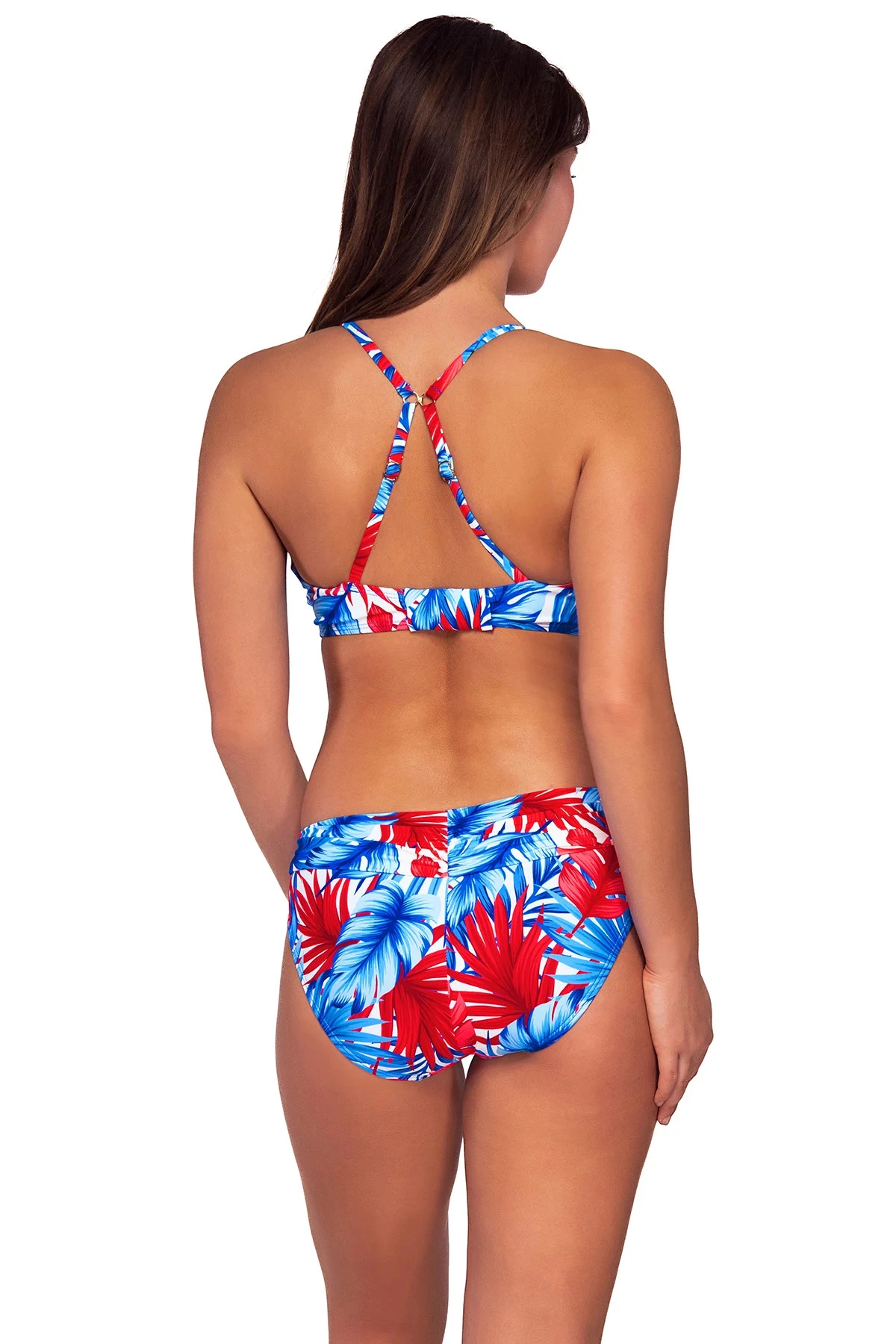 The Kauai top is designed with a keyhole for adjustable coverage. Also featuring an underwire, removable cups for support, adjustable straps with a j-hook and a hidden bra back closure.