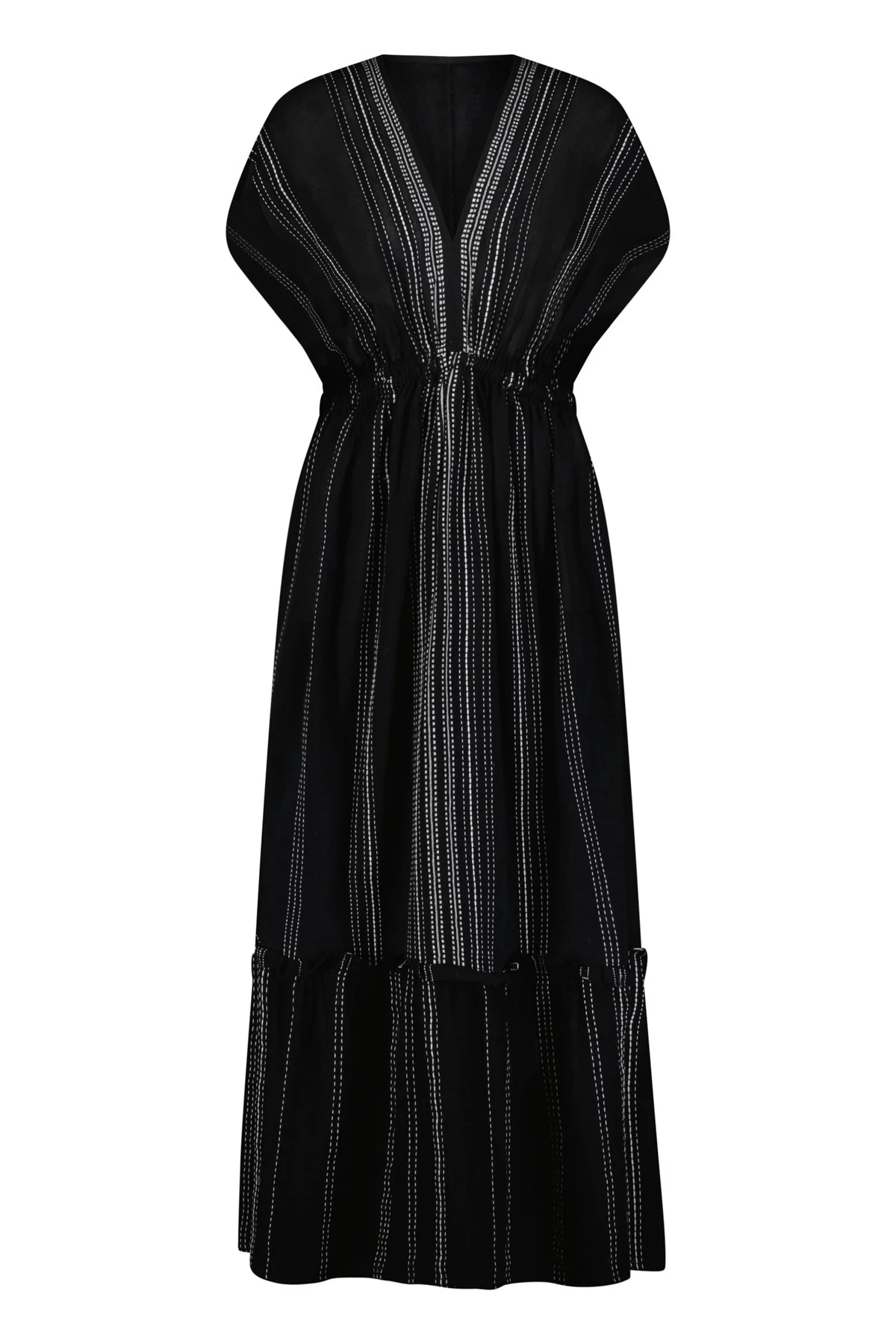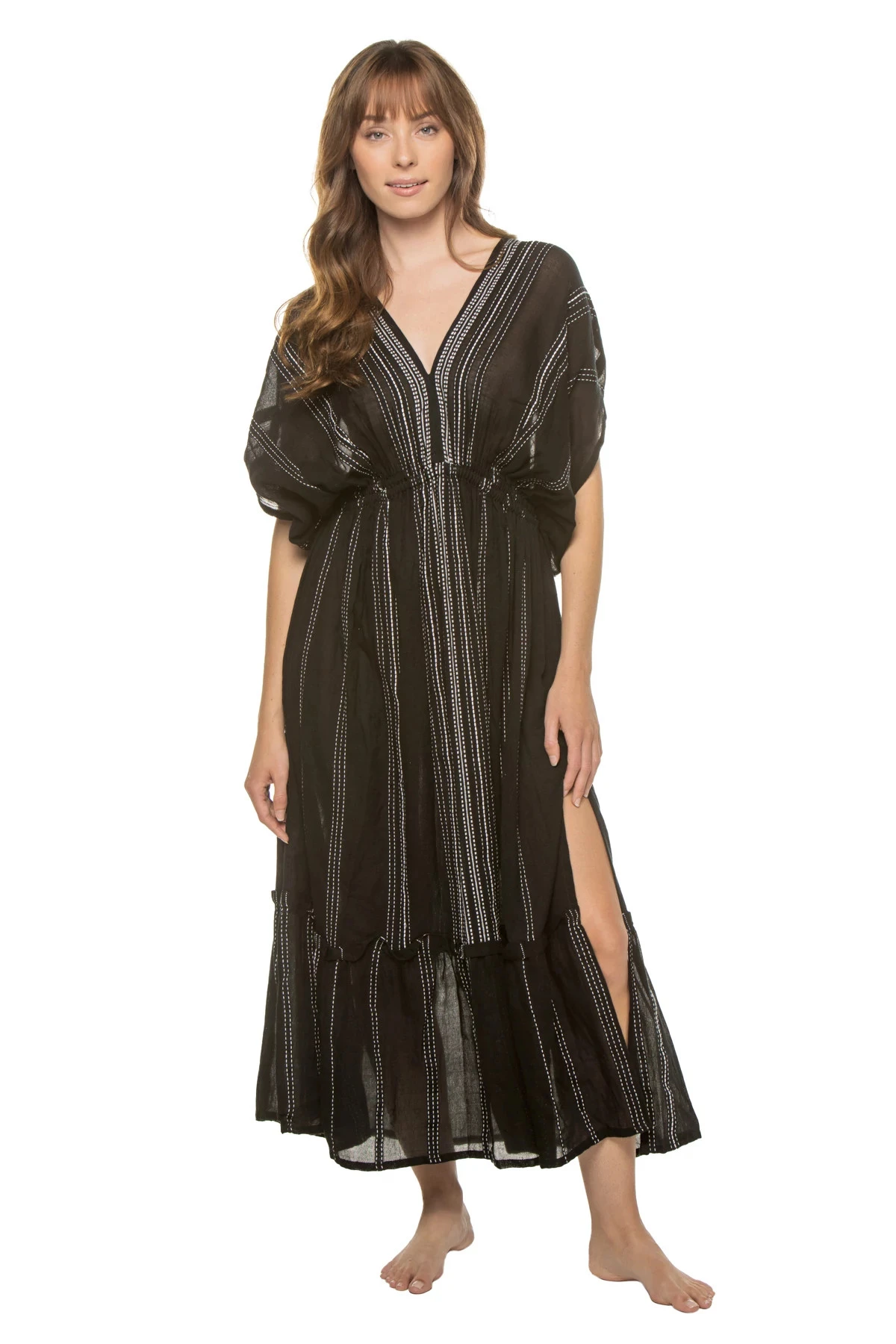 Leliti maxi dress is hand woven in super-soft hand spun cotton featuring a v-neckline, side slits and a ruffle hem. Offers diaphanous dolman sleeves that help to create an hourglass silhouette with its gathered elastic waist.