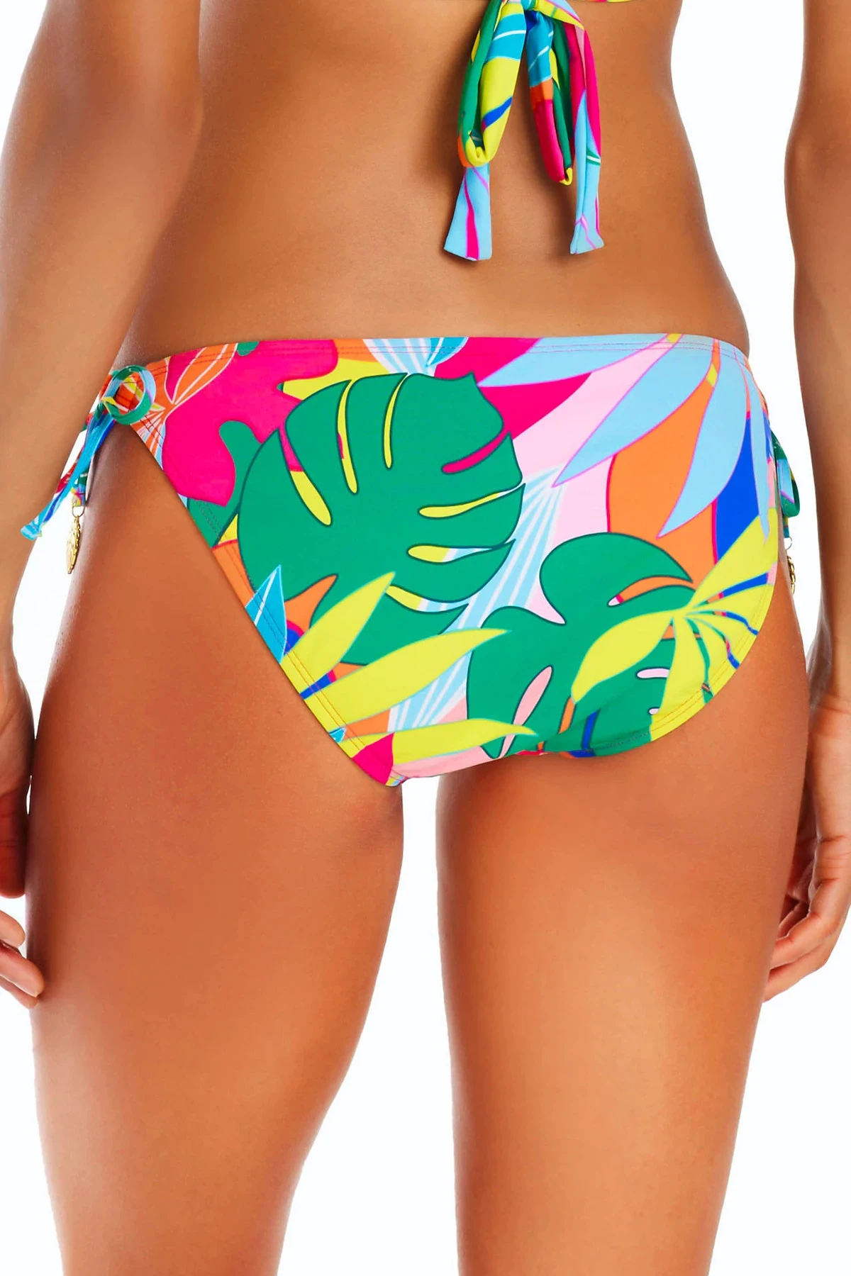 Hipster bikini bottom features a vibrant tropical print and offers side ties with moderate coverage.