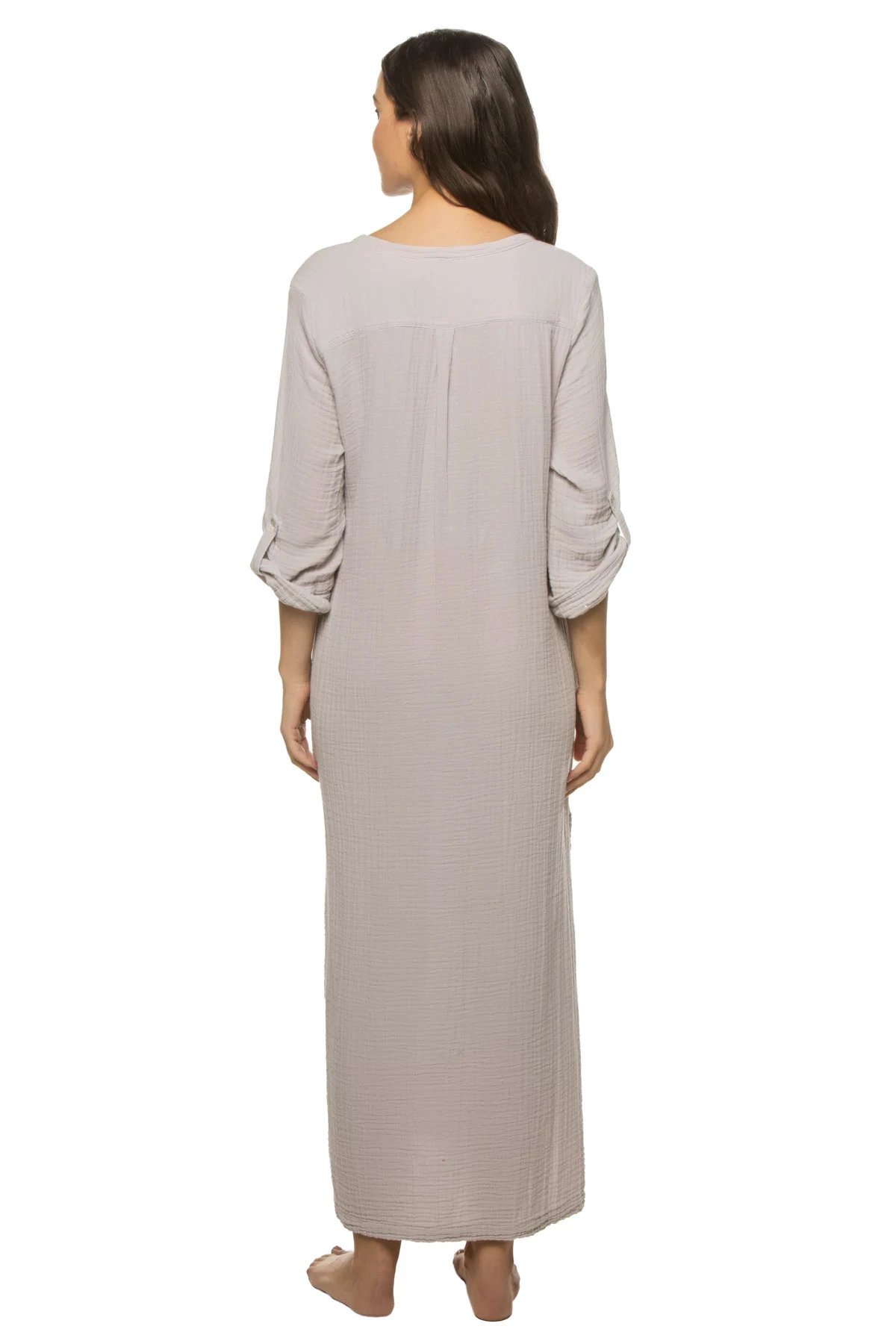 Tracey maxi dress features three quarter length sleeves, a v-neckline, side slits and a front pocket and offers front button closures.