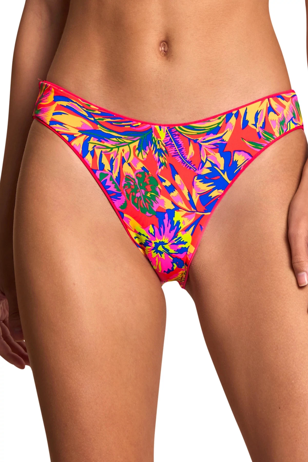 Sublimity hipster bikini bottom features a reverse solid to tropical print and offers moderate coverage.