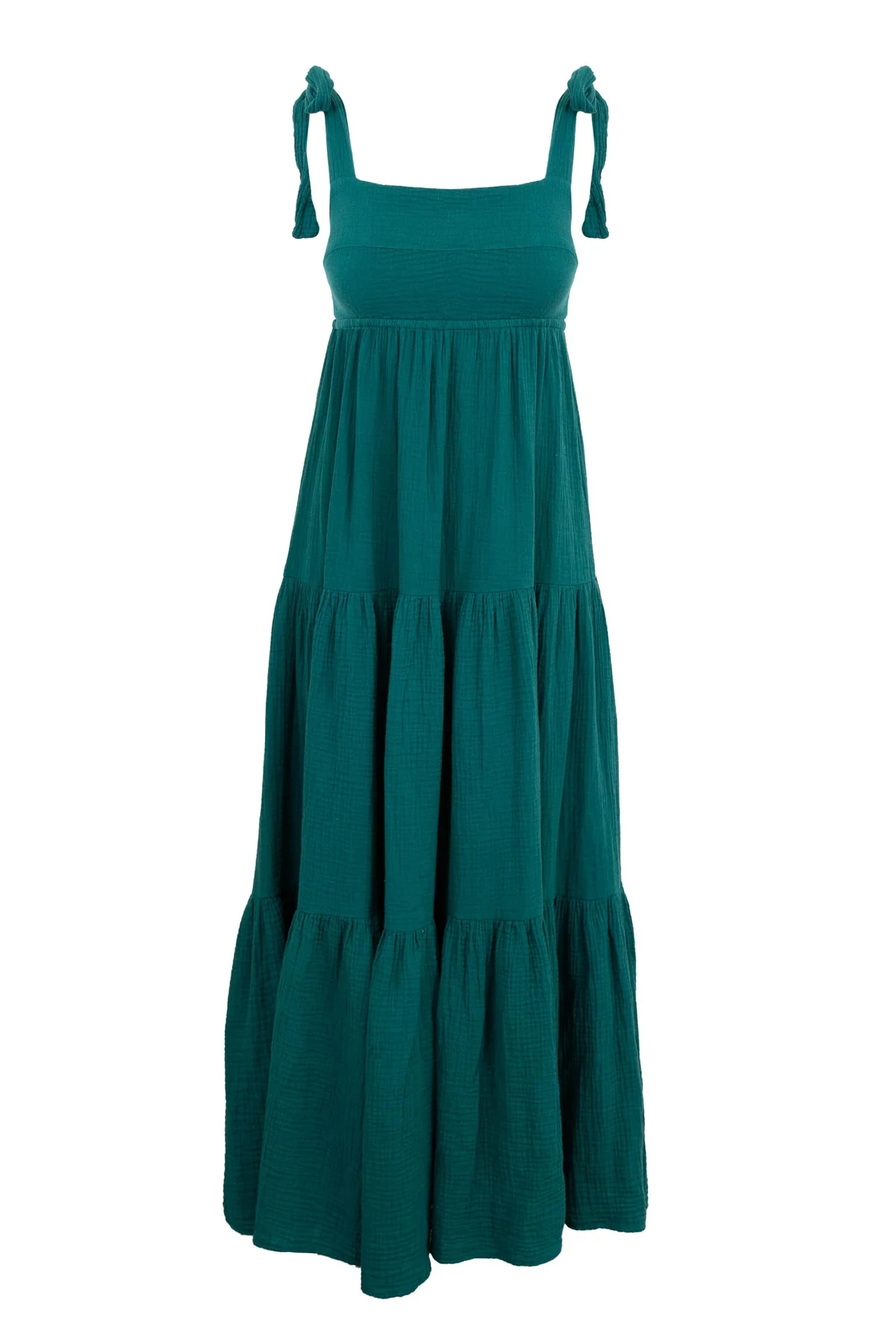Marguerite maxi dress is a beautiful, simplistic slip on featuring a soft squared neckline accentuated with thick bow tie shoulders and a smocked waist that cascades into a tiered, lightly ruffled maxi skirt.
