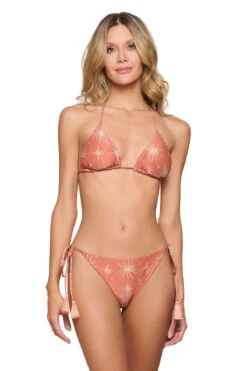 Metallic triangle bikini top features a reverse print to solid and offers adjustable tassel ties at neck and back.