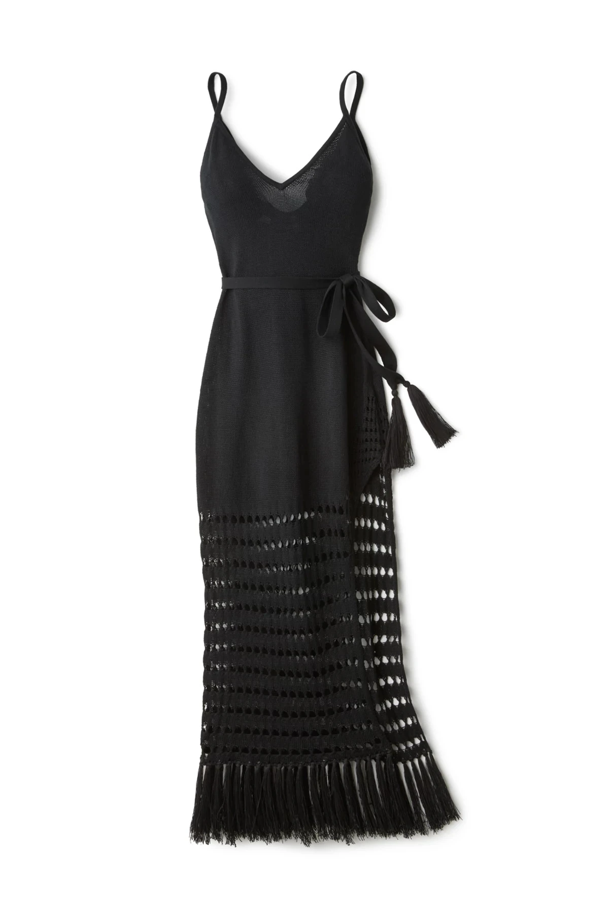 Molly maxi dress features a knit fabrication with a v-neckline, low back and side slit. Offers tassel ties at waist.