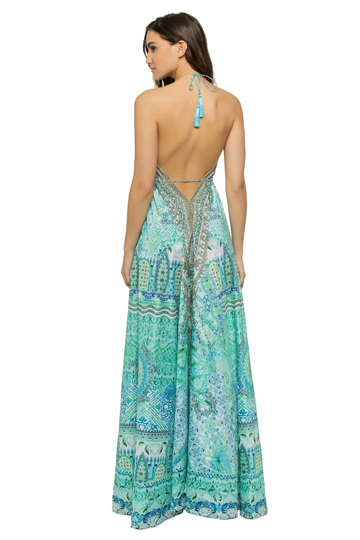 Paradise halter maxi dress features an ultra flowy silhouette with a plunging neckline and open back that offers adjustable tassel ties