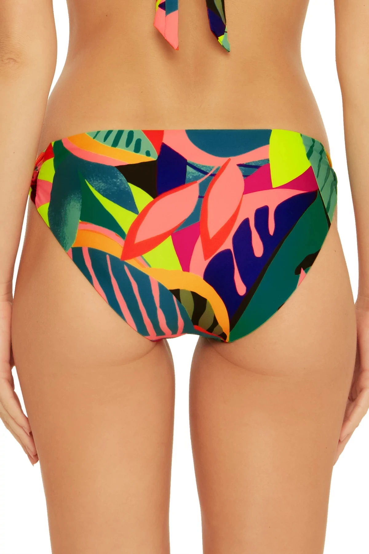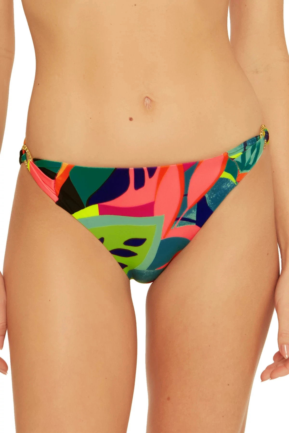 Rainforest hipster bikini bottom features a bright tropical print and offers textured gold ring side accents with moderate coverage.