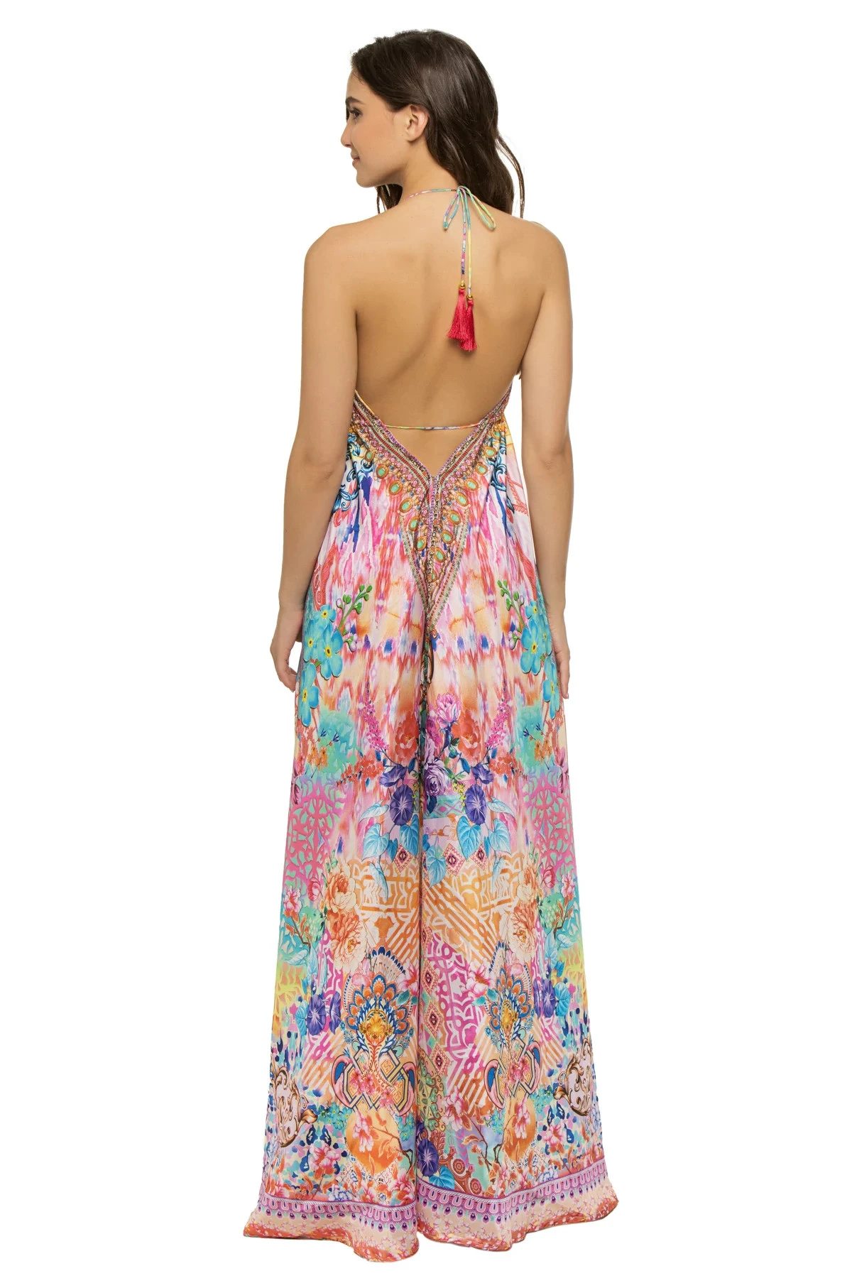 Spring vibes halter maxi dress features an ultra flowy silhouette with a plunging neckline and open back that offers adjustable tassel ties.