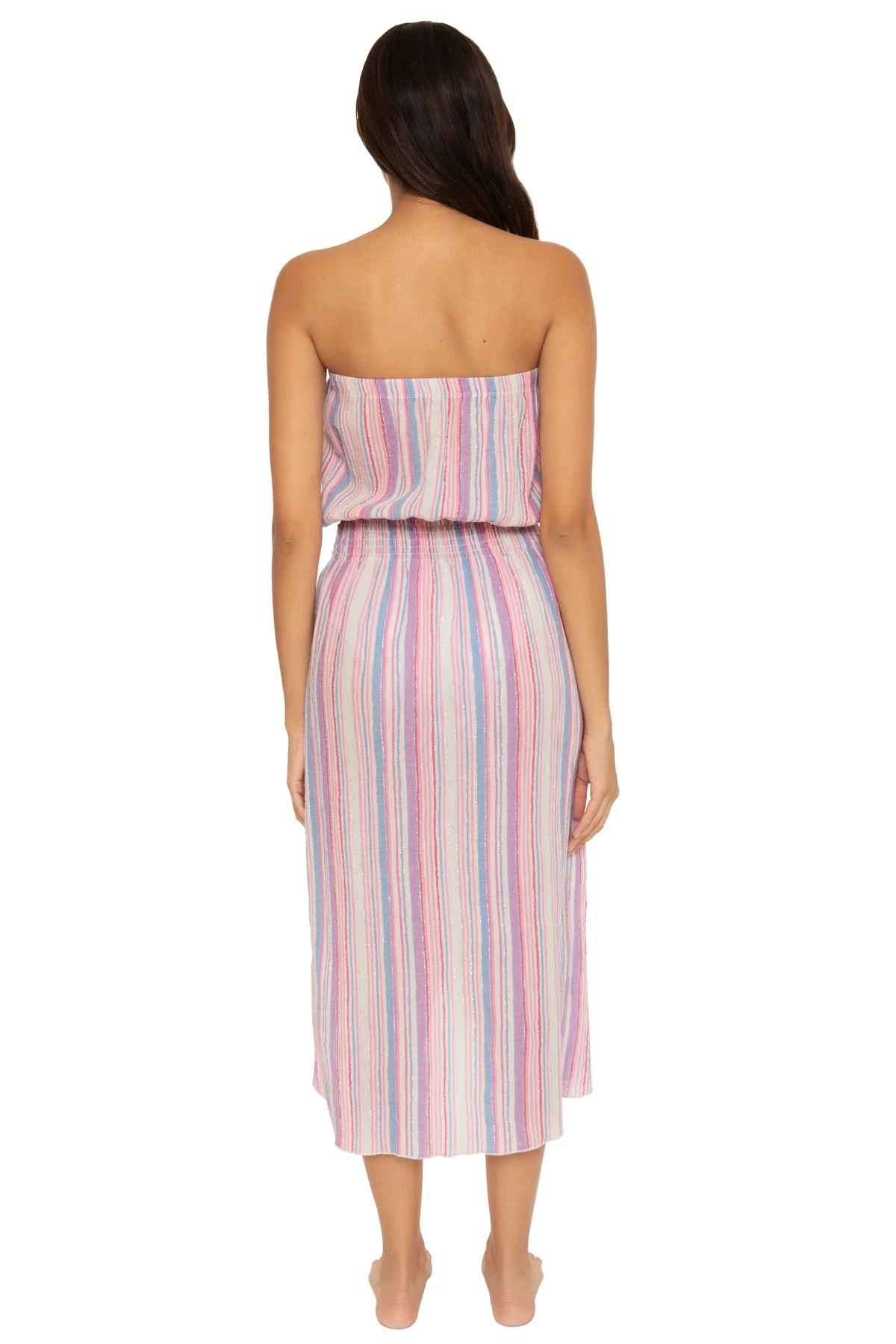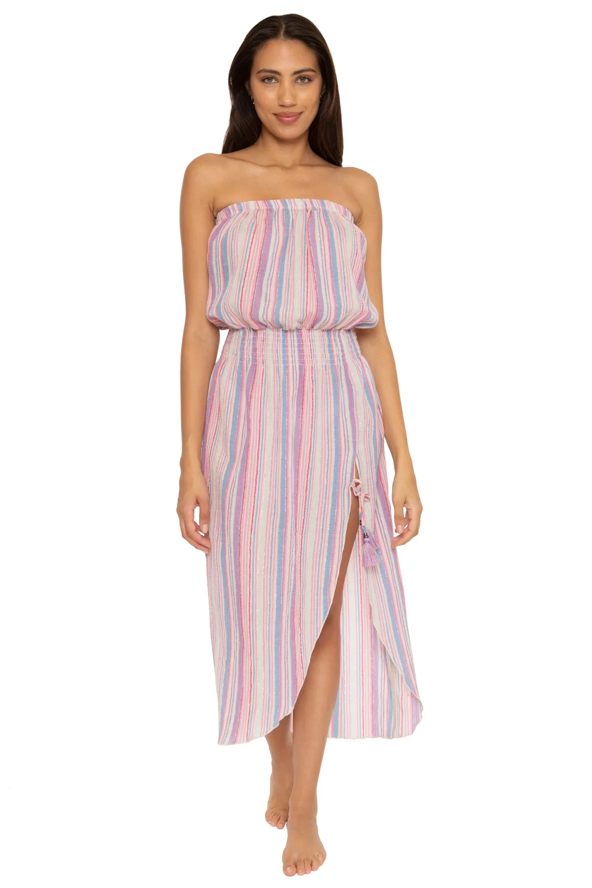 Strapless midi dress features a smocked waist, tulip hem, and a side slit that offers adjustable tassel ties.
