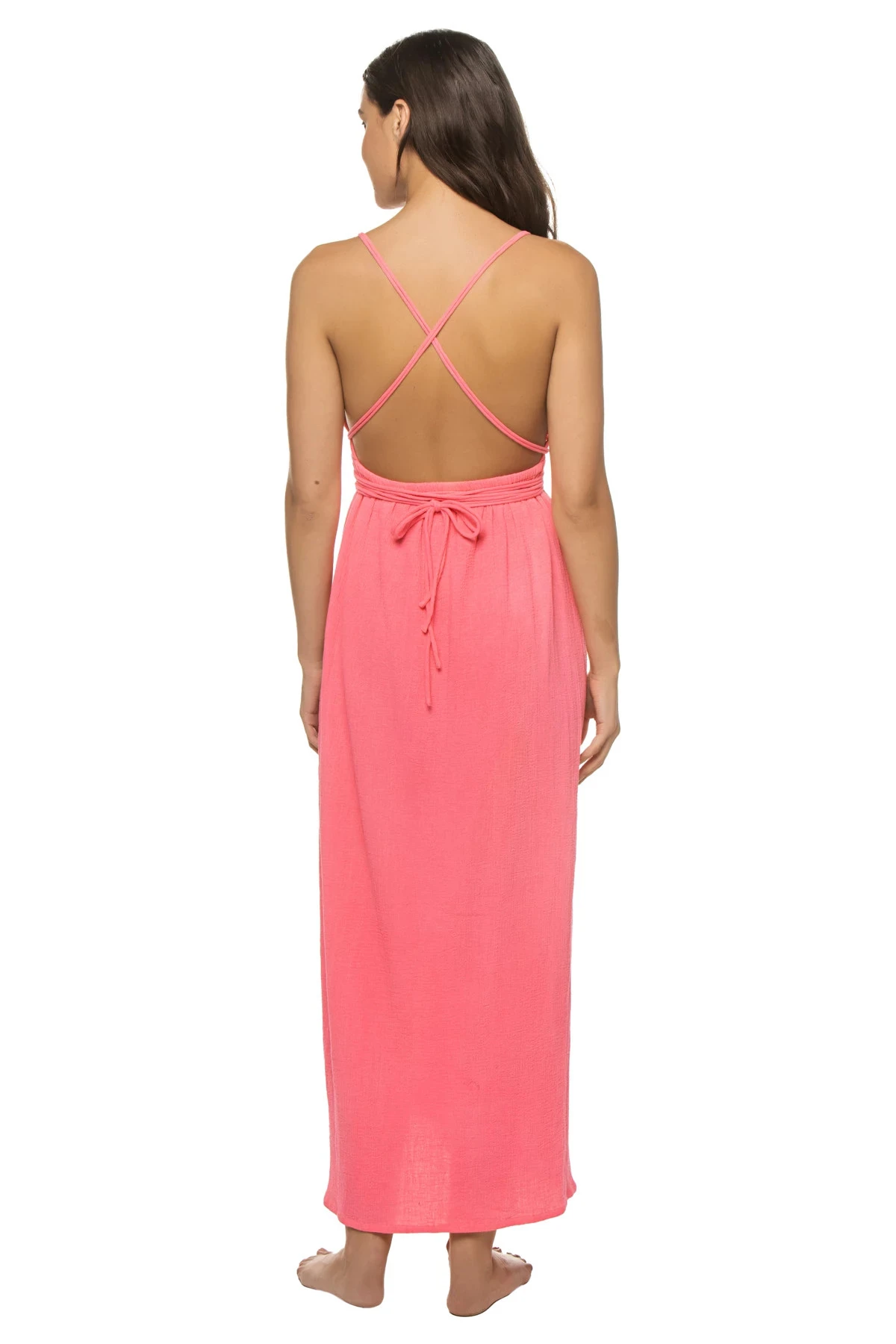 Sybille maxi dress features a plunging neckline with a flirty skirt slit and offers long adjustable wrap around straps.