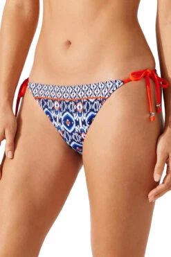 Hipster bikini bottom features thin adjustable tie sides accentuated with silver pill cord ends and offers moderate coverage. Reversible.