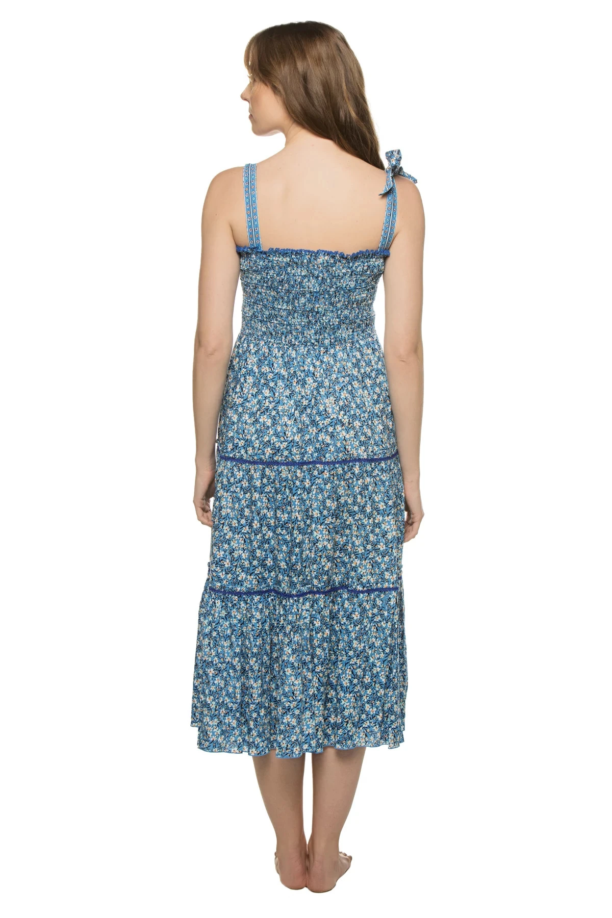 Triny midi dress features a ditsy floral print with a smocked bodice, decorative button details and a pleated tiered skirt.